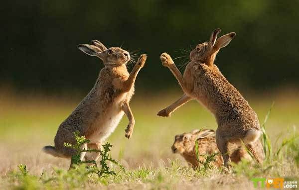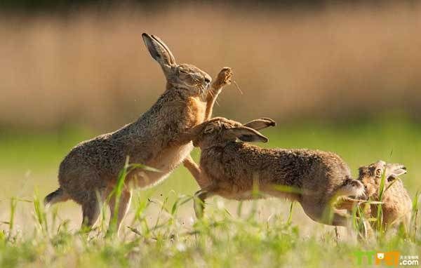 在自然界中,有很多精彩的故事,小动物们也演绎着它们的故事,诉说着它们的爱情与生活,这不英国摄影师就抓拍到野兔的幸福生活瞬间。英摄影师西蒙•利藤(Simon Litten)伪装在草丛中两小时,抓拍到了一组野兔们在阳光下嬉戏,并以它们“传统”的击掌方式求偶的画面。