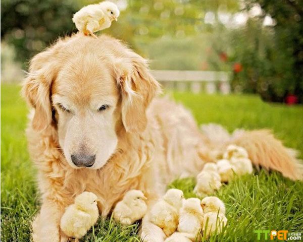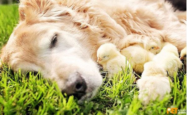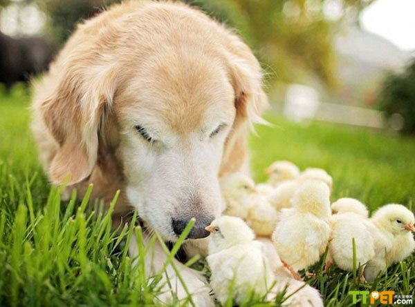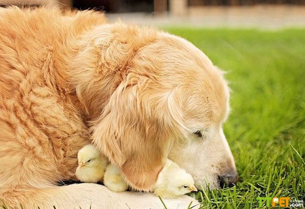 而在其他多数照片中,金毛犬“冠军”则尽显温柔。只见它俯下身子,用鼻轻拱着它的新玩伴们,一副小心翼翼的模样,生怕“大块头”的自己会踩着压着这些毛茸茸的小生灵。而小鸡仔们也喜欢将自己小小的身子埋进“冠军”的长毛中以寻求温暖。