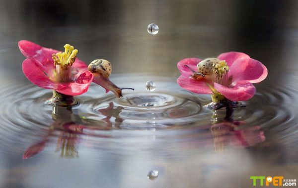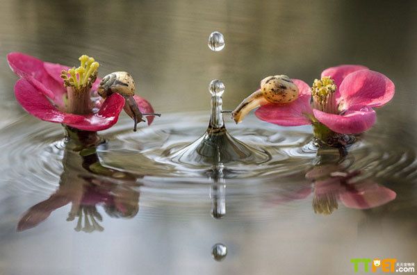 镜头里的蜗牛把脖子伸得老长,注视着水面上的“无底洞”。它们看得目不转睛,整整五分钟一动不动。39岁的职业摄影师帕尼扎说:“我当时准备拍一系列池塘的照片,想拍水面上那两朵花,突然发现花上有两只蜗牛,它们看着水滴落下来都看呆了。一开始我还以为它们看的是自己在水里的倒影呢,结果其实是在看水滴溅起来的涟漪。看着这两只蜗牛实在是很好玩,但我不知道它们是怎么想的,我猜它们是特别有好奇心的蜗牛吧。”