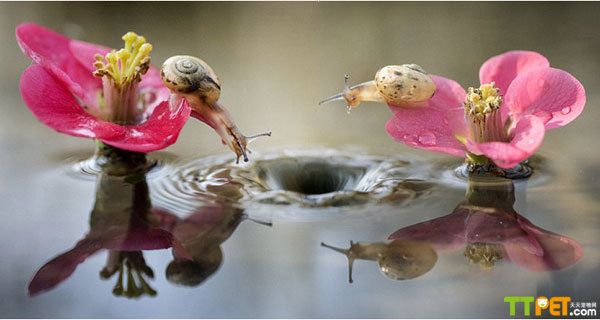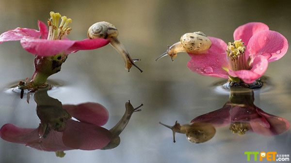 摄影师阿尔贝托·吉兹·帕尼扎在意大利帕尔马的波河边上捕捉到了一个有趣的画面:两只蜗牛尽其所能地从两朵花的边缘伸长了脖子向水面一探究竟,原来是水滴落下造成的小小漩涡迷住了它们。
