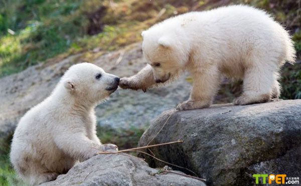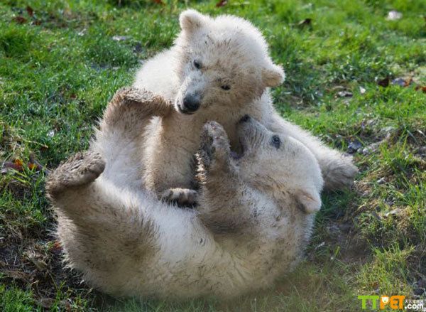 看见大大的北极熊你是不是也会畏惧呢?不过小小的幼崽却给人们可爱的一面。去年12月在德国德国慕尼黑海拉布伦动物园(Hellabrunn Zoo)出生的双胞胎北极熊,日前正式被赋予了新名字。不过,从照片中来看,这两个小家伙仿佛并不在乎外面的世界,依旧在草地上翻滚打闹,尽情享受玩闹的乐趣。