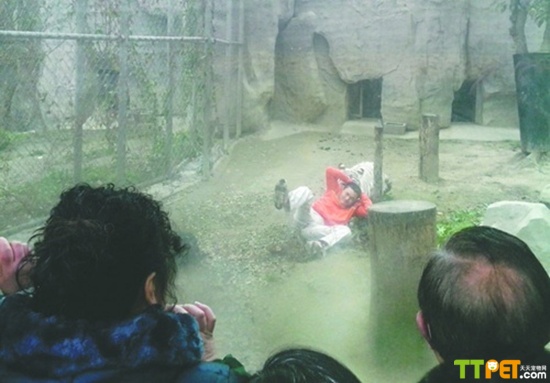 近日,成都市动物园内两只懒洋洋的老虎趴在狮虎苑中供游客观赏。突然,虎园墙外游客出现一阵骚动,只见一个橙衣男子站上墙头,纵身跃进虎圈。面对两只老虎,男子不但不怕,反而连吼带叫、手舞足蹈与老虎对峙起来。其中一只母老虎反倒被吓得退到墙根。另一只老虎则在惊吓之余,扑向这名男子。在被拖行了几米之后,老虎总算松了口。事发后,成都动物园立即启动应急预案,50多名工作人员先后到场,果断麻醉白虎,20分钟后,男子被成功营救。