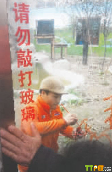 被一只白虎抓扯后,饲养员让其往工作人员通道逃离,可男子不理不睬,从背包内拿出红色墨水、笔,慢慢地朝着隔离玻璃处走去,开始在玻璃上“作画”。