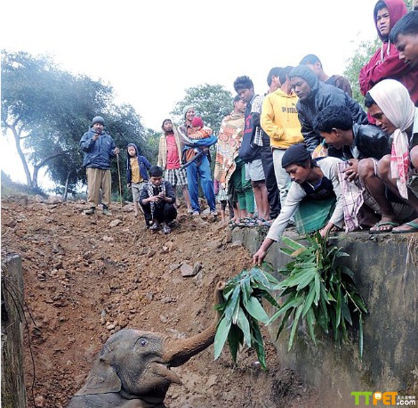 当时,象群正往阿萨姆邦迁徙,照片中的这头小象为了跟上大部队,不小心从铁轨上滑落,掉入了铁轨下面的壕沟里。得到消息后,几十名村民纷纷伸出援手,前来帮助这头深陷泥潭的小象。有的人拿着长棍爬下壕沟,试图让小象抓着棍子爬上来;还有的人给它一些食物,以防它的体力透支。