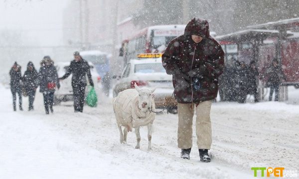2013年11月18日,户外下起了鹅毛大雪,温度达到零下20度左右。曹大娘牵着羊步履蹒跚地走在大雪中。冬天,零下二十几摄氏度,怕羊冻着,曹伶给“大宝子”做了棉服保暖。大雪天出来溜羊,很多市民觉得很新奇。