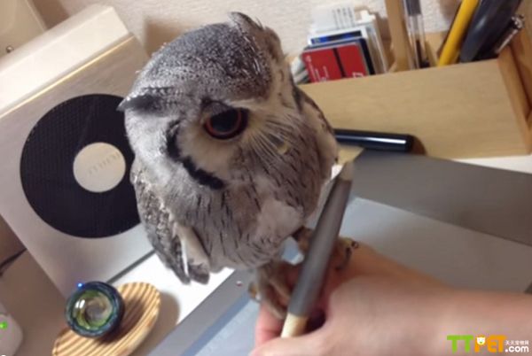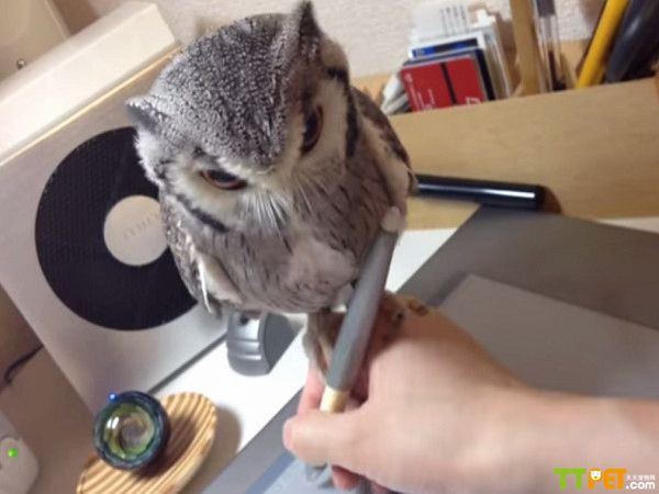 和家里的宠物在一起也是很开心的事情,不同的宠物会有不同的表现,在日本一只可爱的猫头鹰就缠着家长,每时每刻都粘着家长。这是一只白面猫头鹰,在主人工作的时候,就栖息在他的手上。尽管这位日本人的插画家,并且要经常使用数码书写设备,这个小家伙还是能轻松的呆在主人手上。