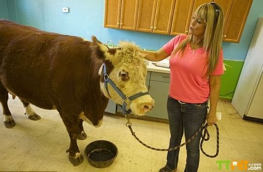 来自一个非营利基金会的女子贝斯说,叫做“奶昔”的这头奶牛是从一个疏于照料的动物收养所救出来的,当时它被关在笼子里。