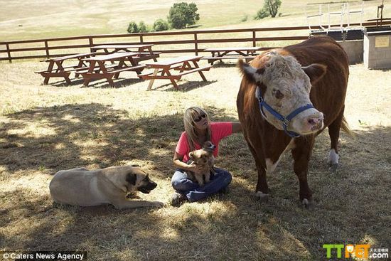 在美国加州有一头奇怪的奶牛,它和别的奶牛长得没有什么不同,只是它不喜欢吃草,常年和狗狗们生活在一起,身边没有同类相伴,自以为自己是一只狗狗,习性都跟狗类似,甚至不知草为何物。