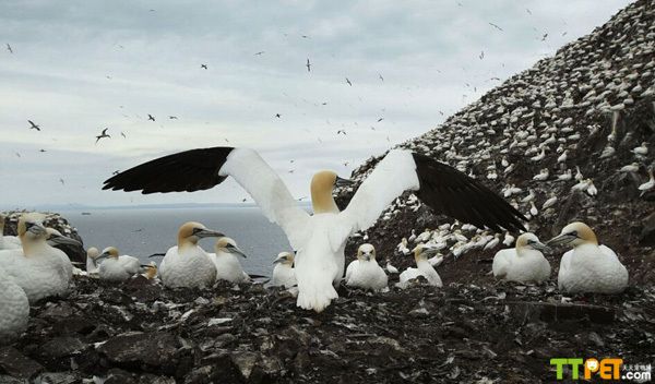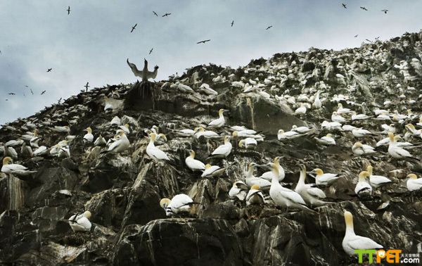 从照片中可以看到,很多塘鹅已在岛上悬崖的顶端筑巢。因塘鹅体态呈白色,整个巴斯岩已经成为一片白色的海洋,有的塘鹅在巴斯岩上空盘旋,而有的则翱翔于高空。在寸土如金的岛上,繁殖期的鸟儿们都忙于筑巢繁殖,它们利用好每一寸有限的空间为繁衍后代做准备。